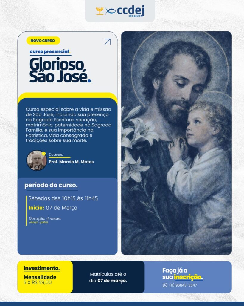 Um curso especial para conhecer mais profundamente a vida e a missão de São José, passando por sua presença na Sagrada Escritura, sua vocação e matrimônio, a paternidade na Sagrada Família, além de sua importância na Patrística, na vida consagrada e nas devoções e tradições sobre sua morte.